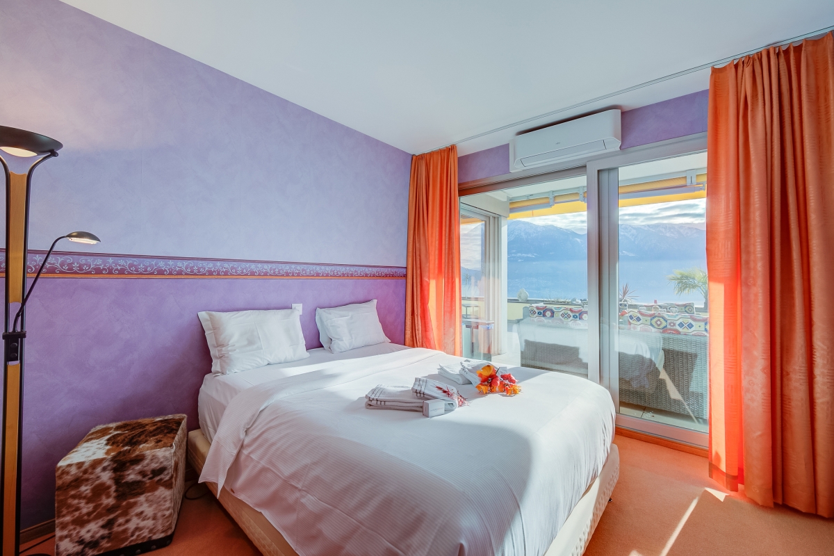 Laze at Lake Maggiore with this sun-dipped panoramic holiday apartment with a magnificent lake-view terrace with open-air dining! Perfect to accompany a relaxing Lake Maggiore vacation, this mountain-view apartment accommodates up to 4 guests and is suitable for all ages. The modern apartment is ideal for those who appreciate the comfort of an evening dinner on a beautiful terrace with all its facilities overlooking the lake. The beautiful shared indoor pool is naturally lit thanks to the windows that help maintain constant contact with the surrounding nature. Inside, the hillside rental is equipped with air-conditioning and central heating to provide comfy year-round lake breaks in Locarno. There is a bright and spacious living room with a well-equipped kitchen, 2 double bedrooms, a bathroom with a bathtub and a smaller but equally practical bathroom with a shower. A dishwasher, oven, induction hob and fridge with a freezer are available for use. The convenience of having a garage just a few meters from your flat will allow you to load and unload your car without any problems. Sleeping Bedroom 1: A bright and modern lake-view bedroom with a double bed and wardrobe. Bedroom 2: A naturally-lit lake-view bedroom with a double bed and wardrobe. Bathroom Bathroom 1: A full family bathroom with a bath with shower and WC. Bathroom 2: A modern complimentary bathroom with a shower and WC. Additional • Free Wi-Fi • Shared indoor swimming pool (heated) • Ironing Facilities • Washing Machine • Lift • Garage • 2 Sun Loungers • Child-Friendly • Suitable for Elderly • BBQ Location The holiday apartment has a bus stop located just below the property and is connected by an external staircase which can be reached in one minute. Within a 10-minute’ drive guests can access almost everything that Locarno has to offer including Piazza Grande with its vibrant shops, restaurants and gelaterias, the beautiful Fontana Pedrazzini, Locarno Falconeria, and even the funicular to the iconic Madonna del Sasso. For our active guests, the Lido di Locarno and a golf course are also located within a 10-minute’ drive. Meanwhile, for those who want to enjoy picnics and relax on summer afternoons by the lake, Giardini Jean Arp is also about the same distance. Guests can also explore the lovely town of Ascona easily from this accommodation in Locarno. The nearest airport is Lugano Airport (a 48-minute drive) and the closest international airport is Milan Malpensa, about a 1-hour and 45-minute drive from here. A supermarket is 20-minute walk away to facilitate an easy self-catering stay.