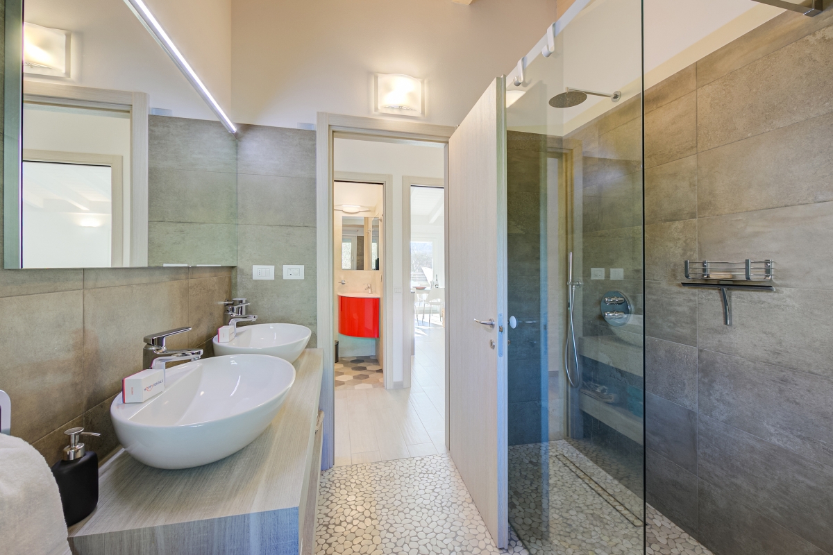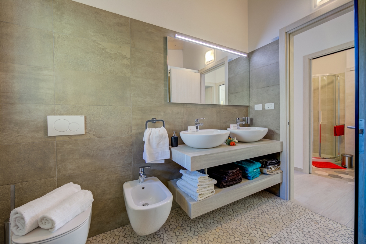 Bathroom 1: A modern master bathroom with a shower, a sink with a mirror, WC and a bidet.