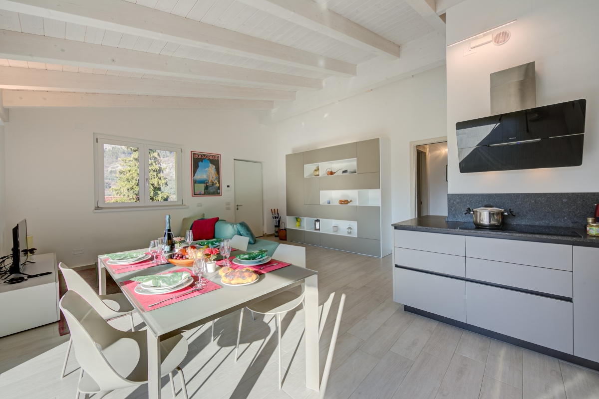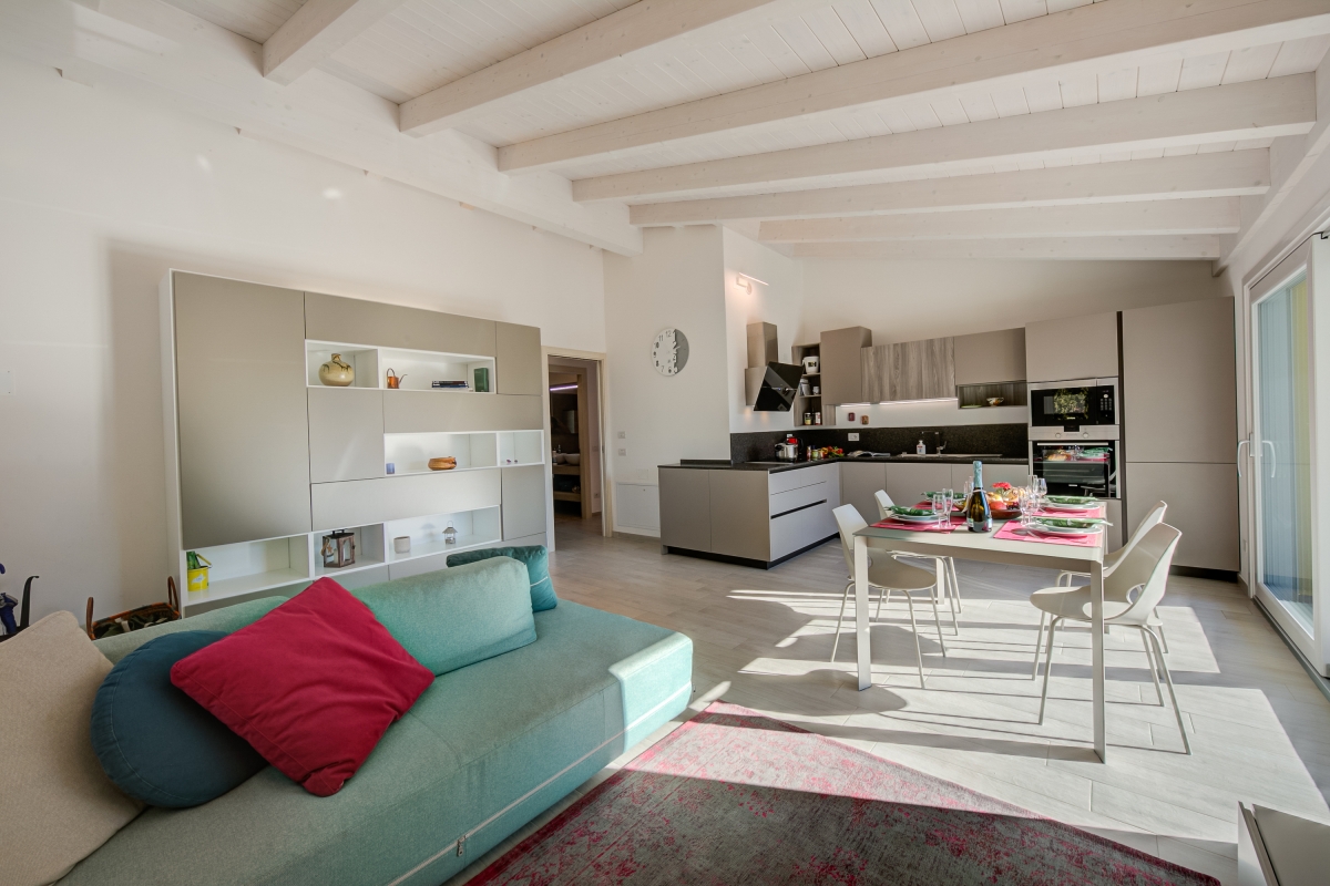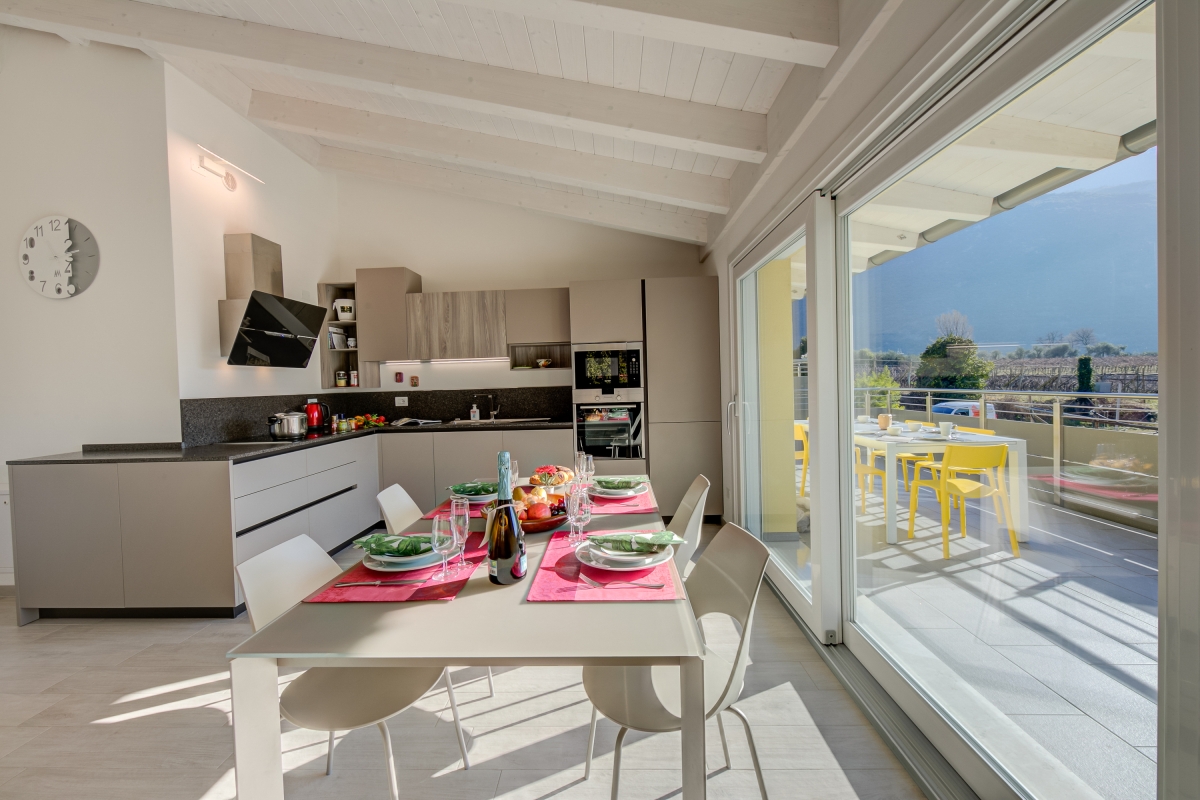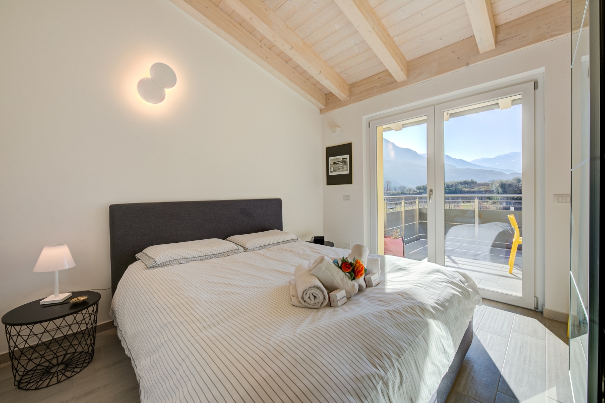 The sun-dappled holiday apartment is perfect to enjoy the best of the natural paradise of the Trentino region. It is brand-new and located on the first floor, surrounded by a view overlooking the mountains and the countryside. Guests can also enjoy a large, sunny terrace and open-air dining in peace with loved ones. Inside, you will find 3 bedrooms, 2 bathrooms and a fully equipped kitchen that ensures a comfy and convenient self-catering stay. The extremely vibrant living room has a refreshing vibe and minimalistic modern furnishings that include lounging and a dining area. The kitchen features a dishwasher, microwave, oven, fridge with freeze, Moka coffee machine and induction hob.