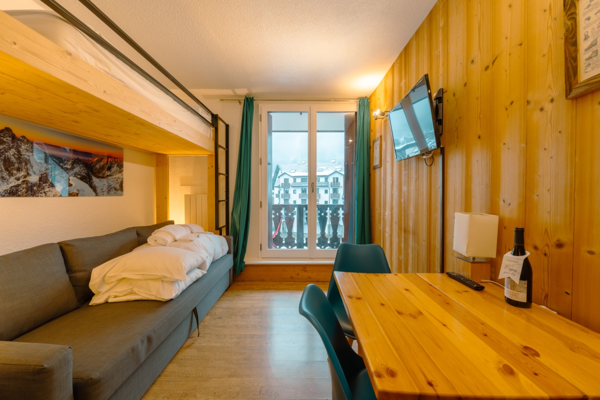 This studio apartment for 3 people, in the centre of Chamonix Sud, has everything you might need for an action-packed holiday at any time of year. This third-floor apartment (with lift) has a contemporary, alpine living area, with French windows leading out to a delightful, private balcony over-looking the Alps. The balcony has a small table and two chairs for al fresco dining. In the living area there is a cosy sofa, with flatscreen TV and a dining table for two. The well-planned, kitchenette next to the living and dining areas is well-equipped with an induction hob, oven, fridge, kettle and drip coffee machine. Sleeping The sofa in the living area converts into a comfortable, double sofa bed. There is also a single bed. There is a wardrobe in the hallway. Bathroom The stylish, modern bathroom, has a full bath and shower, washbasin and W.C. Additional • Flatscreen TV • Free Wifi • Electric radiators • Smoke detector • Close to skiing and ski lift • Free public parking (parking spaces cannot be guaranteed) but car not necessary • Child friendly and Suitable for elderly guests • Laundry Facility • Washing Machine Location Centrally located near to all of Chamonix’s amenities, the apartment is very close to L’Aiguille du Midi cable car station for skiing in the Vallée Blanche. The ski shuttle buses to all skiing areas are also close by. Chamonix is a centre for skiing, snowboarding, cross country skiing, sledging and ice skating. In the summer there are numerous options including hiking trails, rock climbing and mountaineering and paragliding. The town has many fine restaurants and bars which will suit all budgets and ages. Geneva airport is a 1 hour 10 minute drive from the apartment, whilst Chamonix-Mont-Blanc station, where you can catch the Mont Blanc Express (no charge) to stations throughout the valley, is just a 10 minute walk away. Due to the unique topography, location, and weather conditions in the Mont Blanc Valley, internet connectivity may be unreliable. Parking spaces are first-come, first-served, and availability is not guaranteed.