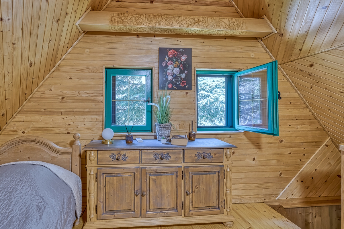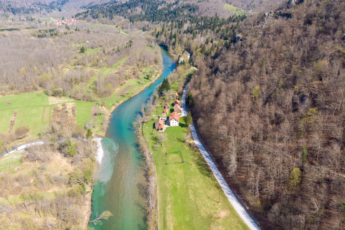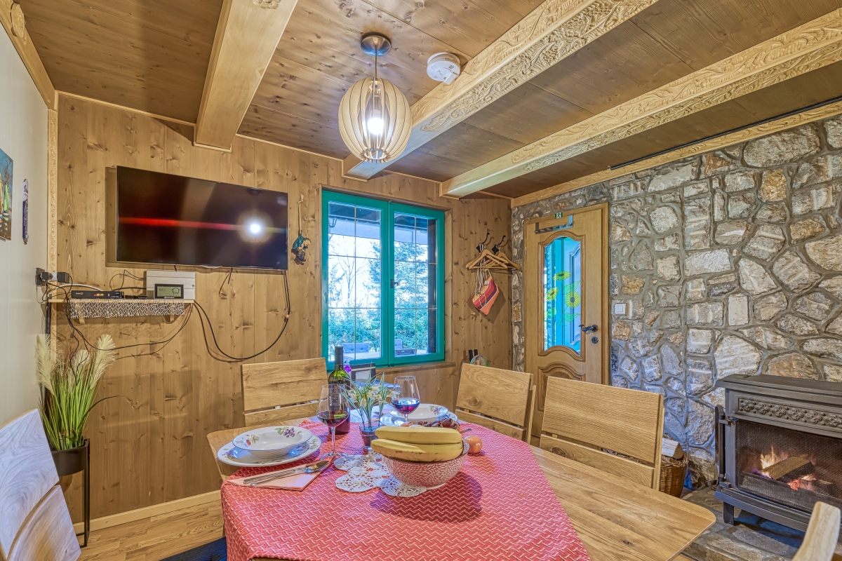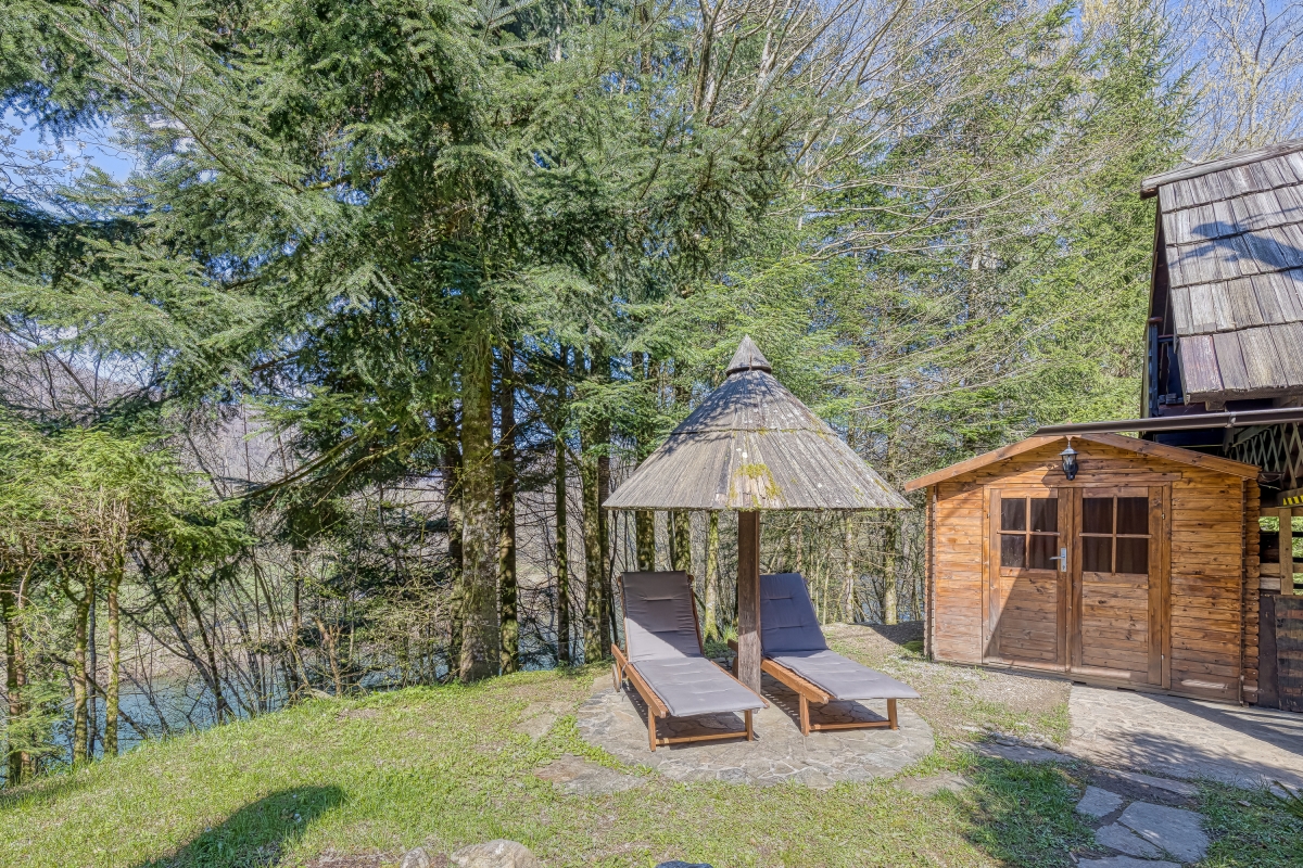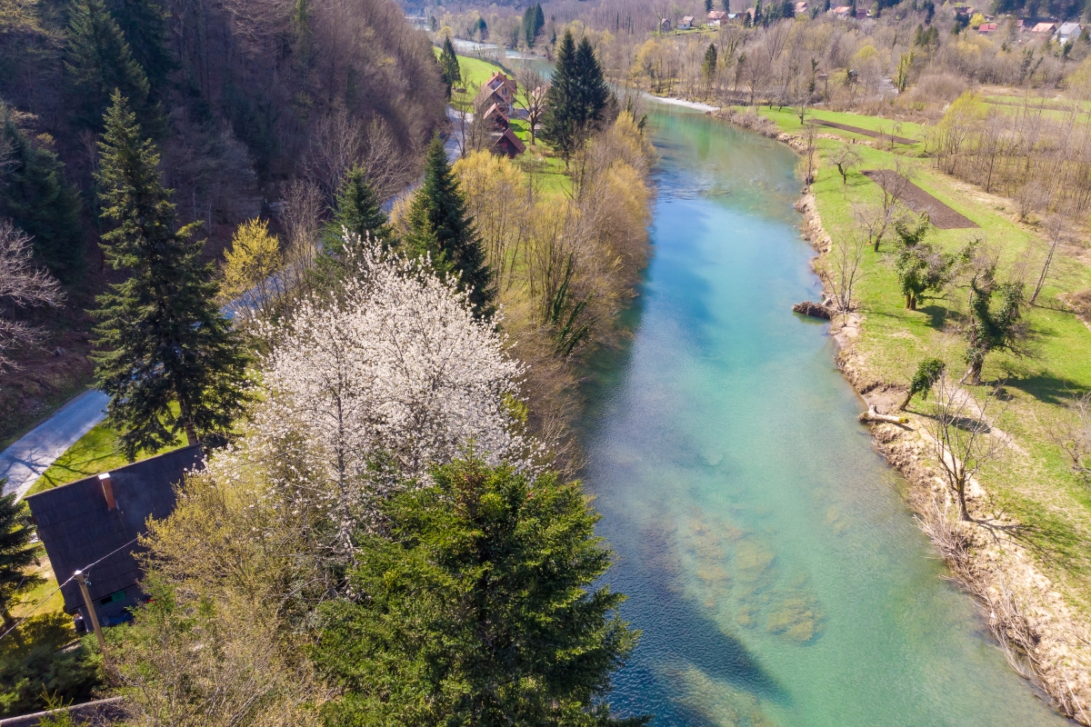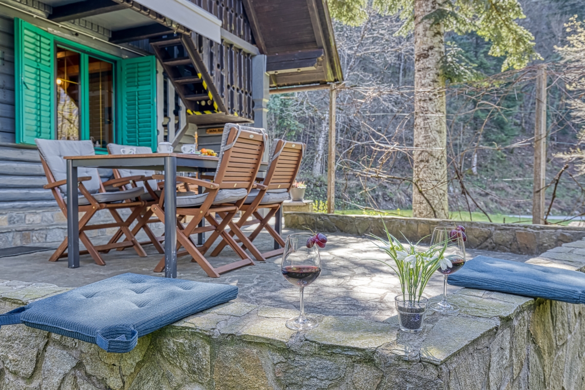 A picture-perfect, romantic cottage, in a small hamlet, nestling between the forest and the River Kolpa, which offers an ideal retreat for up to 5 people who want to escape from it all. Surrounded by trees, just 5 metres from its own private beach on the river, the house is entirely made of wood inside and out. The ground-floor open-plan living area with wooden floors and ceilings has a stove, a sofa and a flat-screen TV. A wooden corner staircase leads to the upstairs bedroom. The kitchen is just off the living room and is equipped with an induction hob, microwave, oven, dishwasher, fridge/freezer and coffee machine. The outside space is as beautifully laid out as the interiors. There is a Finnish sauna, reached via the terrace. The raised stone terrace is furnished with a dining table and chairs for relaxed meals al fresco. An outdoor staircase leads up to the balcony. Further away from the house are two sun loungers, a BBQ and a summer house. Sleeping Bedroom: Tucked under the wooden eaves the bedroom has a double bed and a single bed, with an antique wardrobe. A door leads out to the carved wooden, covered balcony overlooking the river. Extra: The sofa in the living room converts into a comfortable double bed Bathroom The tiled bathroom has a glass shower, basin and WC. Additional • Free Wifi • Smart TV • Tablet • Air conditioning • Central heating • Washing machine • Sauna • BBQ • Outdoor dining area • Private garden • Child-friendly • Suitable for elderly guests • Pets possible • Private parking – car essential • 2 bicycles and an electric scooter are available • Outdoor games • Indoor toys • Close to skiing • Tourist tax of €2.00/per person/day to be paid locally. Location The cottage is on the Kolpa River which marks Slovenia’s southern border with Croatia. This unspoiled region is known for its mighty forests, waterfalls, mountains and castles. There is so much for visitors to see and do. With many hiking trails through gorgeous landscapes, as well as scenic cycling routes. The pristine river offers fishing, rafting and kayaking. There is also tennis and even paintballing nearby. The town of Petrina is 5 minutes away. The town’s bridge over the River Kolpa leads over to Croatia, to the town of Brod Na Kupi. Ljubljana’s international airport is 1 hour 45 minutes away.