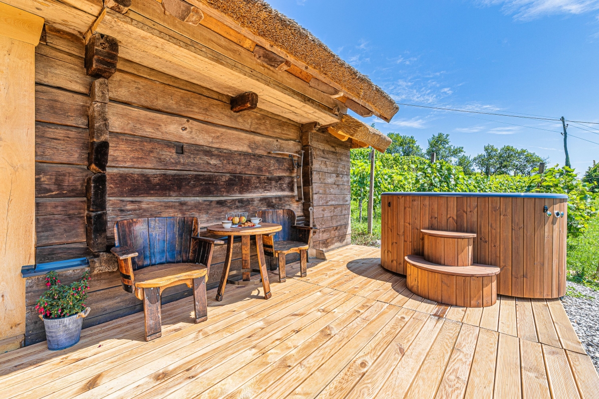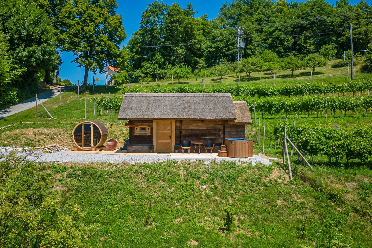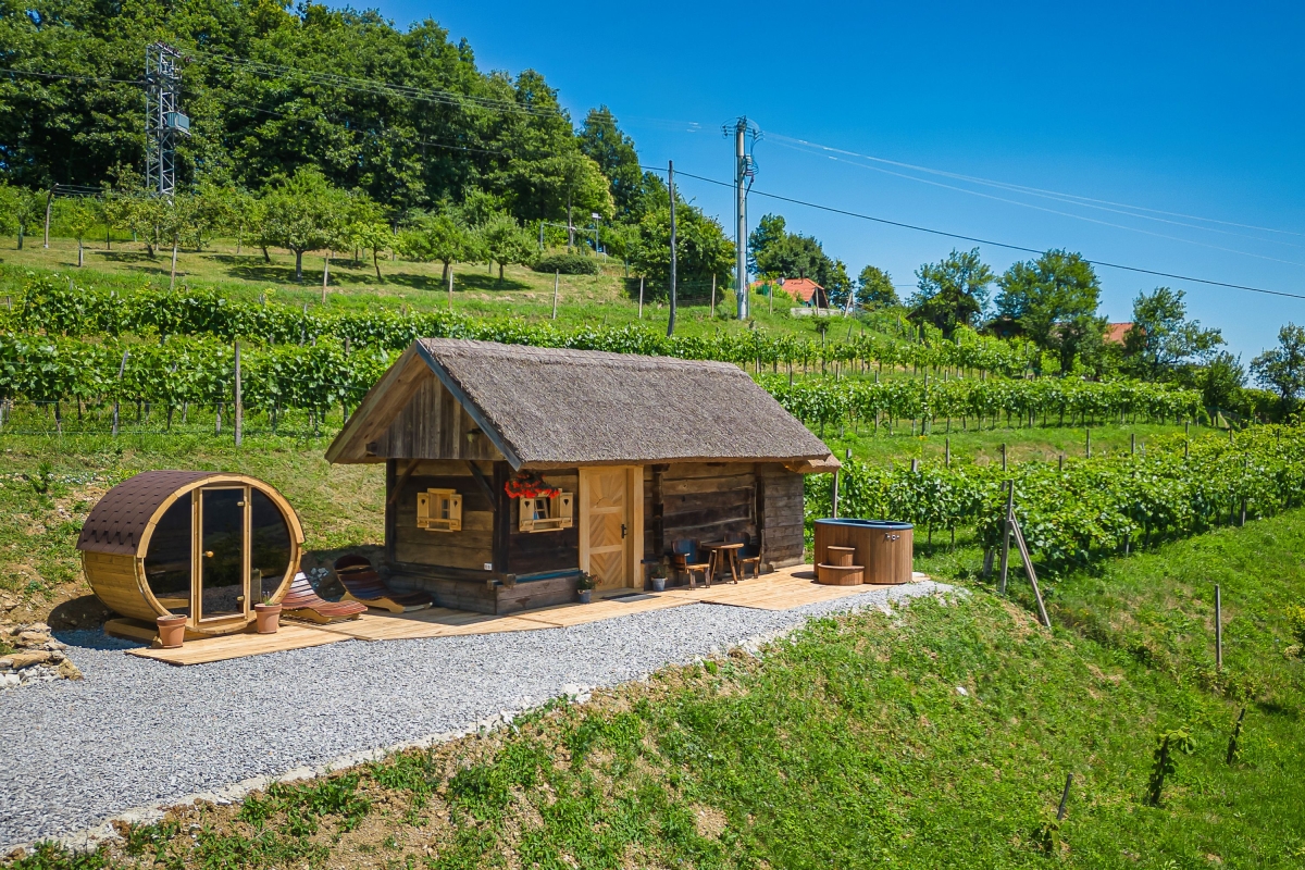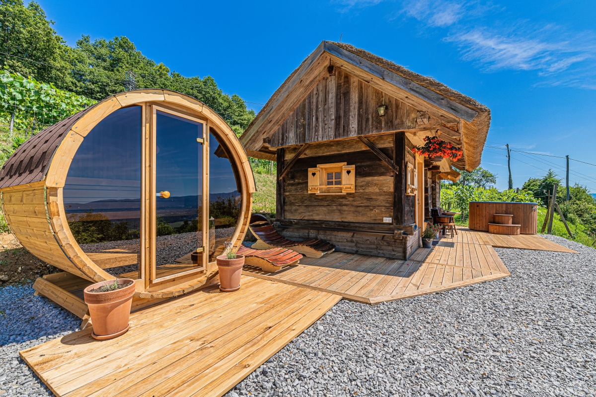 A romantic retreat in a picture-perfect wooden cottage, surrounded by vineyards. This vineyard cottage is the ideal destination for anyone who wants to really escape from it all. Built and finished in wood, the cottage combines traditional and contemporary architecture. The open-plan kitchen is equipped with an induction hob, oven, fridge, freezer for stress-free cooking. A cosy dining table for 2 is tucked into the corner, for casual dining. The owners have lavished as much attention on the outside space as they have indoors. On the wooden deck, there is an outdoor table and chairs for meals al fresco. There is also a novel Finnish sauna in a large wine barrel and two comfortable sun beds. The wooden hot tub has fantastic views across the valley. For authentic rustic relaxation, guests can escape to the hay loft and relax under the thatched roof. Sleeping Bedroom: The cosy bedroom, next to the living room, is furnished with a double bed. Bathroom The modern, bathroom has a shower, basin and WC. The owners welcome guests to their wine cellar for tasting local wines and trying regional foods. For a nominal fee, guests are given the keys to the wine cellar and can help themselves to wine throughout their stay. Seasonal produce from the gardens is also available. The owners have curated many unique experiences for guests which cover the culture and history of the area. They also offer additional wellness treatments including Indian head massages and acupressure. Additional • Free Wifi • Outdoor jacuzzi • Sauna • Central heating • BBQ • Outdoor dining area • Child-friendly • Suitable for elderly guests • Pets allowed • Private parking & EV charger – car recommended • E-bikes available for rent • Tourist tax €2.50/per person/day to be paid on the spot Location In secluded countryside, the cottage is less than 10 minutes from the charming town of Otocec on the banks of the Krka River. Otocec is famous for its island castle. The town also has some excellent restaurants and cafés. Visitors can stock up on their daily provisions from the local shops. For golfers, the local course is 15 minutes from the cottage. There are many activities for adventurous travellers including skydiving, rafting or canoeing, hiking and cycling. For something more relaxed, the area is known for its thermal waters and the spa town of Smarjeske Toplice is less than 10 minutes away. The cottage is halfway between Ljubljana (50 minutes) and Zagreb (1 hour). Both capitals make fascinating day trips. Ljubljana’s international airport is 1 hour 5 minutes away. Otherwise, Zagreb airport in Croatia is 55 minutes.