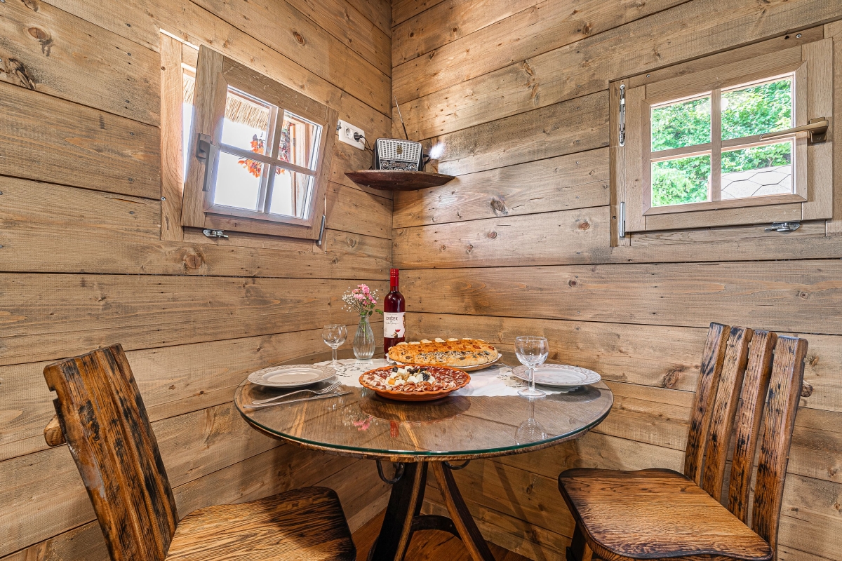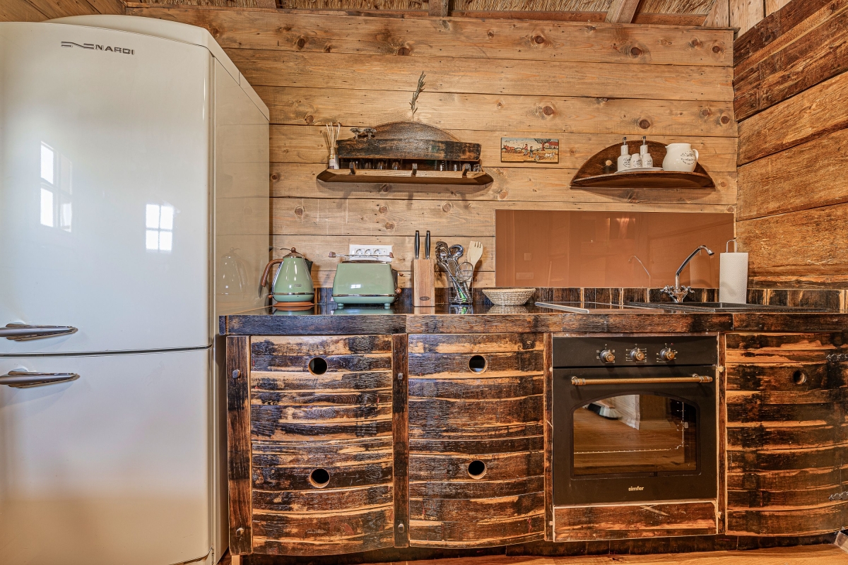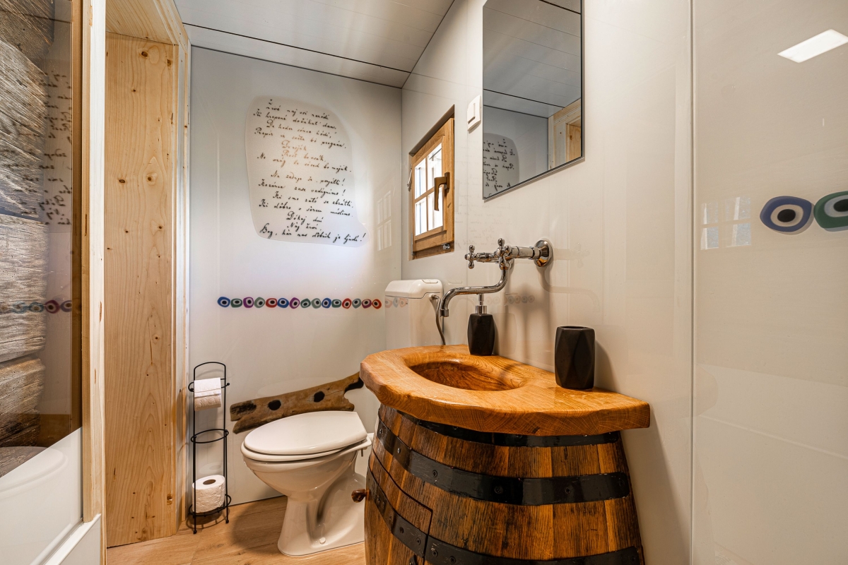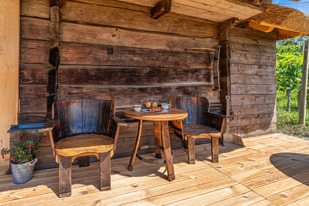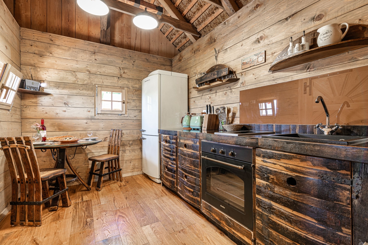 A romantic retreat in a picture-perfect wooden cottage, surrounded by vineyards. This vineyard cottage is the ideal destination for anyone who wants to really escape from it all. Built and finished in wood, the cottage combines traditional and contemporary architecture. The open-plan kitchen is equipped with an induction hob, oven, fridge, freezer for stress-free cooking. A cosy dining table for 2 is tucked into the corner, for casual dining. The owners have lavished as much attention on the outside space as they have indoors. On the wooden deck, there is an outdoor table and chairs for meals al fresco. There is also a novel Finnish sauna in a large wine barrel and two comfortable sun beds. The wooden hot tub has fantastic views across the valley. For authentic rustic relaxation, guests can escape to the hay loft and relax under the thatched roof. Sleeping Bedroom: The cosy bedroom, next to the living room, is furnished with a double bed. Bathroom The modern, bathroom has a shower, basin and WC. The owners welcome guests to their wine cellar for tasting local wines and trying regional foods. For a nominal fee, guests are given the keys to the wine cellar and can help themselves to wine throughout their stay. Seasonal produce from the gardens is also available. The owners have curated many unique experiences for guests which cover the culture and history of the area. They also offer additional wellness treatments including Indian head massages and acupressure. Additional • Free Wifi • Outdoor jacuzzi • Sauna • Central heating • BBQ • Outdoor dining area • Child-friendly • Suitable for elderly guests • Pets allowed • Private parking & EV charger – car recommended • E-bikes available for rent • Tourist tax €2.50/per person/day to be paid on the spot Location In secluded countryside, the cottage is less than 10 minutes from the charming town of Otocec on the banks of the Krka River. Otocec is famous for its island castle. The town also has some excellent restaurants and cafés. Visitors can stock up on their daily provisions from the local shops. For golfers, the local course is 15 minutes from the cottage. There are many activities for adventurous travellers including skydiving, rafting or canoeing, hiking and cycling. For something more relaxed, the area is known for its thermal waters and the spa town of Smarjeske Toplice is less than 10 minutes away. The cottage is halfway between Ljubljana (50 minutes) and Zagreb (1 hour). Both capitals make fascinating day trips. Ljubljana’s international airport is 1 hour 5 minutes away. Otherwise, Zagreb airport in Croatia is 55 minutes.