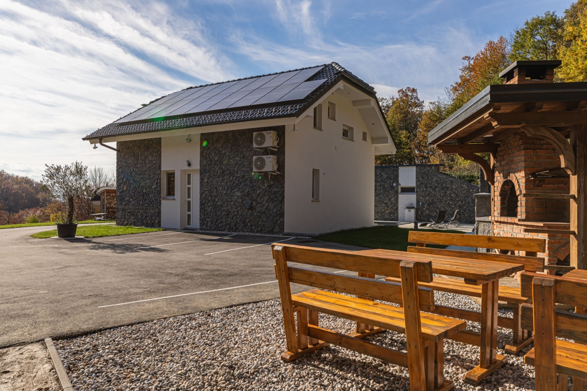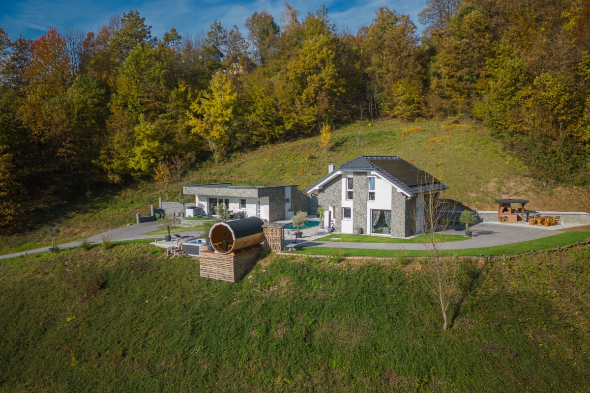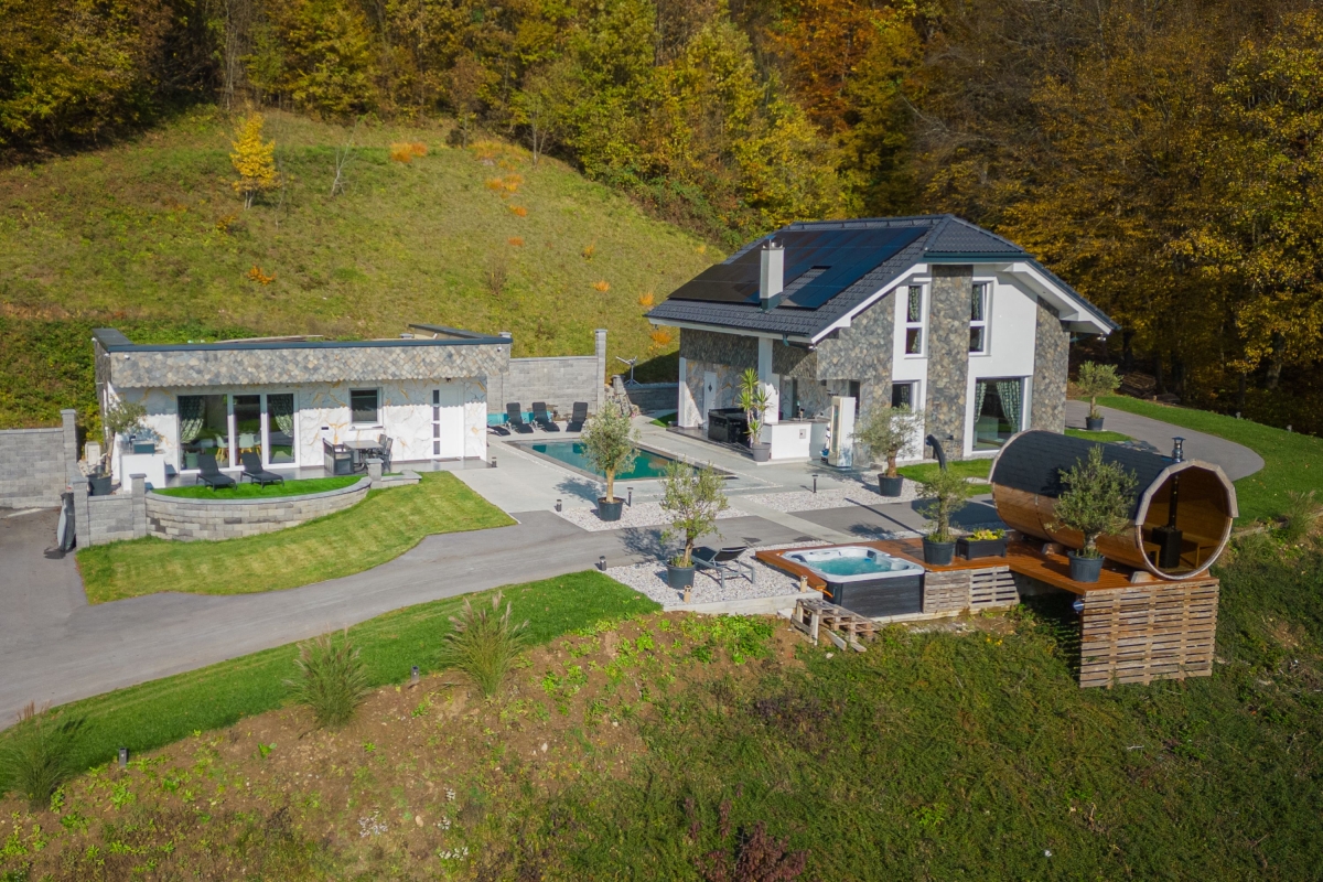 Experience a luxury holiday with an outdoor jacuzzi, a barrel sauna and a shared BBQ in this semi-detached house for 10! The gorgeous two-level semi-detached house among the greenery is more than just a holiday gateway. With shared amenities such as a relaxing jacuzzi (indoors and outdoors), a garden with a sparkling pool with sunbeds, an outdoor panoramic Finnish sauna in the form of a reclining barrel, and an outdoor dining area, the house offers a splendid stay with 10 guests, welcoming families with children. Along with an indoor sauna, exclusive outdoor dining and a large massage tub for two guests, the retreat sets the scene for heavenly relaxation in nature. Just a few meters away, there is a meadow as a part of the resort, where, depending on the season, you can pick local organic fruit. There is also a tiny garden with high beds, where you can pluck fresh homegrown tomatoes, peppers, parsley and some other spices. As you step inside, a vast living room unfolds with stylish interiors, providing modern comfort with plush sofas and a smart TV. Adjacent, an open kitchen awaits, equipped with modern amenities, from a dishwasher to a Dolcegusto coffee machine, ensuring all culinary adventures are well-catered. This newly furnished house has three spacious bedrooms spread across two floors, with air-conditioning and central heating for added convenience. Additionally, the quiet ambience and complimentary WiFi make it suitable for remote work. For simplified travel plans, the house provides a private parking space to all its guests. Sleeping Bedroom 1: A bedroom with a king-size double bed. Bedroom 2: A bedroom with a king-size double bed and a single bed. Bedroom 3: A bedroom with a bunk bed and a sofa single. Bathroom Bathroom 1: A finely-tiled bathroom with a bathtub with shower and a WC. Bathroom 2: A well-lit bathroom with a shower and WC. Additional • Smart TV • Flatscreen • BBQ • Shared Garden • Shared Outdoor Protected Pool (heated) • Shared Outdoor Jacuzzi • Shared Sauna • Private Indoor Jacuzzi •Free WiFi • Air Conditioning • Central Heating • Private Parking Space • Coffee Machine • Dishwasher • Child-Friendly • Pets Not Allowed • Smoking Not Permitted Please Note The house is part of Timaja Resort with other on-site properties and shared amenities. Guests can also book (upon availability) Tim House and Apartment Lilly for a larger group. Please ask our booking team for more information. Location Located on the hillside, in the serene Lower Sava Valley of Slovenia, Rihpovec is a small village that features historic landmarks such as the Rihpovec Church, a short 7-minute walk from the detached house. The Otočec Castle, situated on an island in the Krka River, provides a glimpse into Slovenia's rich history in just a 20-minute drive. In about an hour’s drive, guests can visit the Kozjansko Regional Park, renowned for its hiking paths and pristine natural surroundings. Meanwhile, families seeking adventure can make their way to the Olimje Adventure Park, reachable in 1 hour and 15 minutes by car. For day trips, guests can plan a visit to Ljubljana, Slovenia's captivating capital at a 40-minute car ride from the holiday house. Maribor, a city celebrated for its wine culture, is approximately 2 hours away. For your convenience, the nearest supermarkets and restaurants are a 10-15 minute drive from the house. The closest international airport, Ljubljana Joze Pucnik Airport, is about 50 minutes by car.