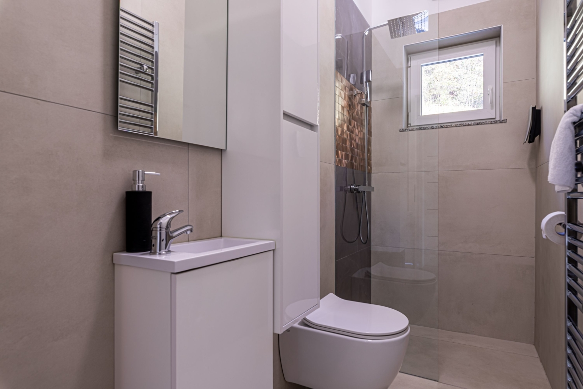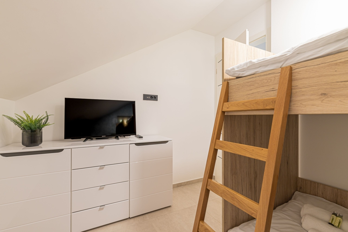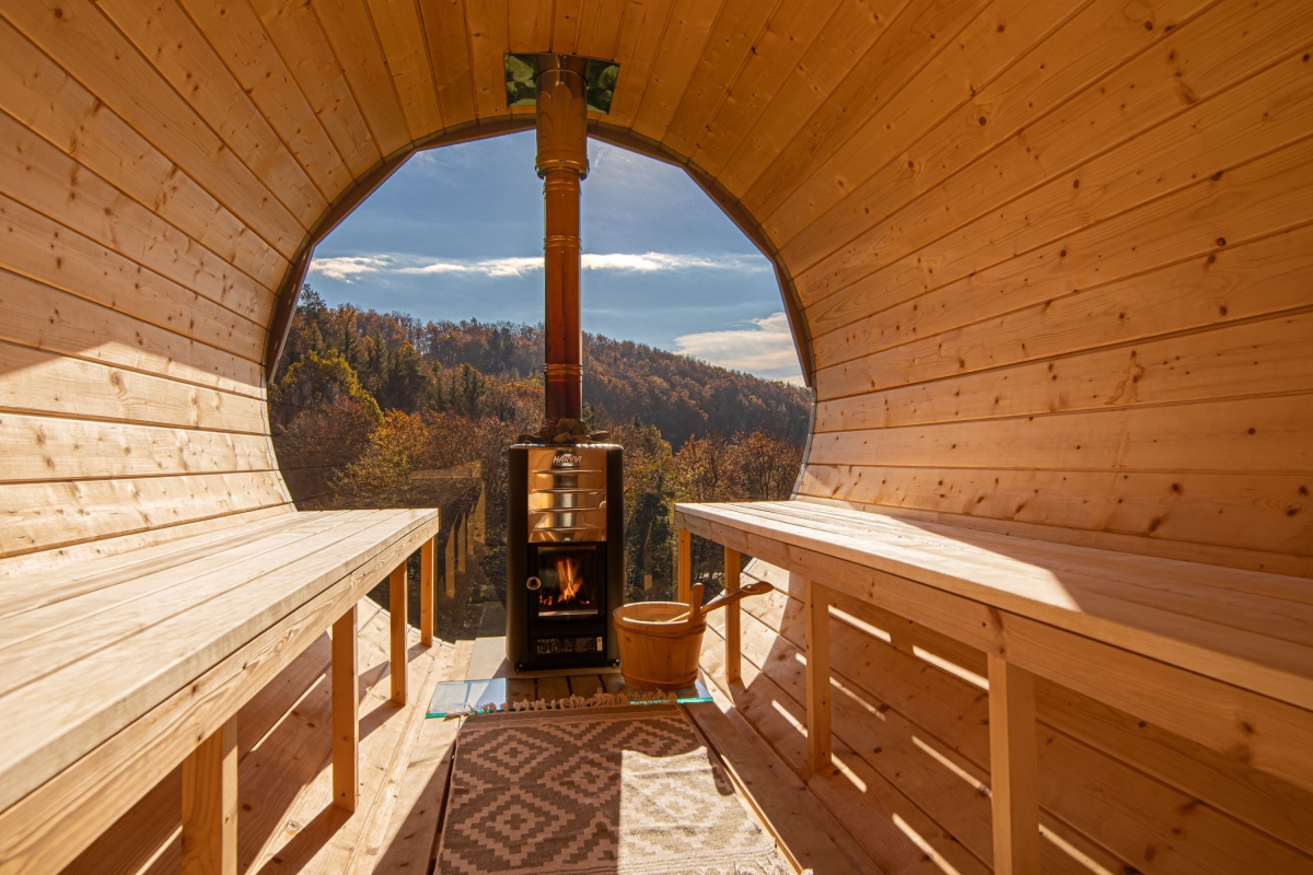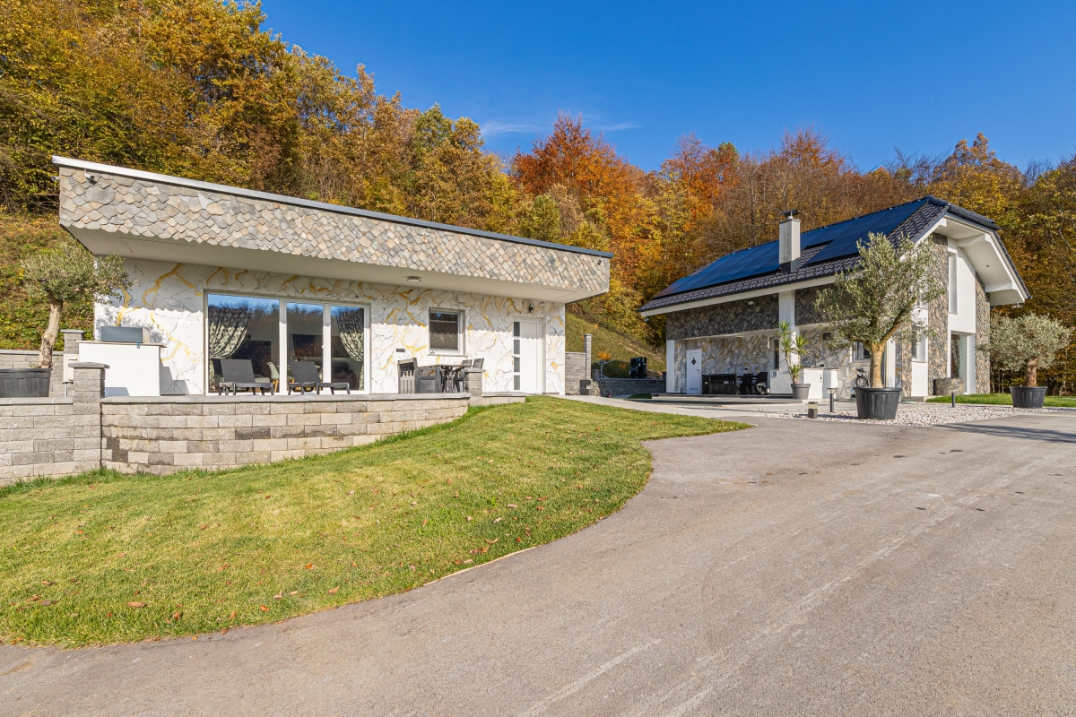Experience a luxury holiday with an outdoor jacuzzi, a barrel sauna and a shared BBQ in this semi-detached house for 10! The gorgeous two-level semi-detached house among the greenery is more than just a holiday gateway. With shared amenities such as a relaxing jacuzzi (indoors and outdoors), a garden with a sparkling pool with sunbeds, an outdoor panoramic Finnish sauna in the form of a reclining barrel, and an outdoor dining area, the house offers a splendid stay with 10 guests, welcoming families with children. Along with an indoor sauna, exclusive outdoor dining and a large massage tub for two guests, the retreat sets the scene for heavenly relaxation in nature. Just a few meters away, there is a meadow as a part of the resort, where, depending on the season, you can pick local organic fruit. There is also a tiny garden with high beds, where you can pluck fresh homegrown tomatoes, peppers, parsley and some other spices. As you step inside, a vast living room unfolds with stylish interiors, providing modern comfort with plush sofas and a smart TV. Adjacent, an open kitchen awaits, equipped with modern amenities, from a dishwasher to a Dolcegusto coffee machine, ensuring all culinary adventures are well-catered. This newly furnished house has three spacious bedrooms spread across two floors, with air-conditioning and central heating for added convenience. Additionally, the quiet ambience and complimentary WiFi make it suitable for remote work. For simplified travel plans, the house provides a private parking space to all its guests. Sleeping Bedroom 1: A bedroom with a king-size double bed. Bedroom 2: A bedroom with a king-size double bed and a single bed. Bedroom 3: A bedroom with a bunk bed and a sofa single. Bathroom Bathroom 1: A finely-tiled bathroom with a bathtub with shower and a WC. Bathroom 2: A well-lit bathroom with a shower and WC. Additional • Smart TV • Flatscreen • BBQ • Shared Garden • Shared Outdoor Protected Pool (heated) • Shared Outdoor Jacuzzi • Shared Sauna • Private Indoor Jacuzzi •Free WiFi • Air Conditioning • Central Heating • Private Parking Space • Coffee Machine • Dishwasher • Child-Friendly • Pets Not Allowed • Smoking Not Permitted Please Note The house is part of Timaja Resort with other on-site properties and shared amenities. Guests can also book (upon availability) Tim House and Apartment Lilly for a larger group. Please ask our booking team for more information. Location Located on the hillside, in the serene Lower Sava Valley of Slovenia, Rihpovec is a small village that features historic landmarks such as the Rihpovec Church, a short 7-minute walk from the detached house. The Otočec Castle, situated on an island in the Krka River, provides a glimpse into Slovenia's rich history in just a 20-minute drive. In about an hour’s drive, guests can visit the Kozjansko Regional Park, renowned for its hiking paths and pristine natural surroundings. Meanwhile, families seeking adventure can make their way to the Olimje Adventure Park, reachable in 1 hour and 15 minutes by car. For day trips, guests can plan a visit to Ljubljana, Slovenia's captivating capital at a 40-minute car ride from the holiday house. Maribor, a city celebrated for its wine culture, is approximately 2 hours away. For your convenience, the nearest supermarkets and restaurants are a 10-15 minute drive from the house. The closest international airport, Ljubljana Joze Pucnik Airport, is about 50 minutes by car.