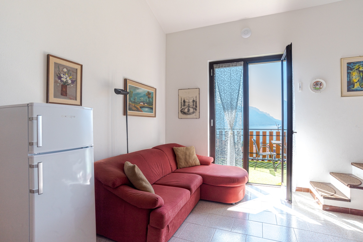 A first-floor apartment for 4 people, in an elegant residence in the hills above Menaggio. It offers stunning views over Lake Como and makes an ideal base from which to explore the lake and beautiful countryside nearby. The apartment’s contemporary décor makes it a stylish and comfortable retreat. The sunny, open-plan living area, is furnished with a sofa and flatscreen TV. The dining table with 4 chairs is next to the kitchen, which is equipped with an induction hob, microwave, fridge, freezer and coffee machine. Large glass doors lead from the living room to a private balcony with a panoramic view over Lake Como. The table and chairs allow guests to relax and enjoy the scenery with a cup of coffee or an aperitif. Open stairs lead up to the mezzanine bedroom. Sleeping Bedroom: The bedroom has a double bed, a single bed and a wardrobe. Extra: The sofa in the living room converts into a comfortable double bed. Bathroom The tiled bathroom has a shower, basin, bidet and WC Additional • Balcony • Free wifi • Outside dining • Central heating • Fan • Hair dryer • Suitable for elderly • Private parking – car essential Location The elegant residence is in a quiet location, just a 20-minute walk (5-minute drive) from the lake shore. The town of Menaggio (7 minutes) is charming and not as busy as some of the other towns on the lake. It has a lovely square with a wide choice of cafés, restaurants and shops. Guests can take a ferry from Menaggio to Varenna or on to Bellagio and spend a day in these famously beautiful towns. The apartment is close to many restaurants and other amenities. There is even a restaurant/pizzeria on the ground floor of the building for lunch, dinner or takeaway. For guests who want to cook for themselves, Menaggio’s farmers market takes place on the 2nd and 4th Friday of the month. Here you will find the best local ingredients. Lake Como Adventures (20-minute drive), offers a wide range of activities including climbing, canyoning, hiking and skiing in the winter months. For something more relaxing, there is the Lido Menaggio (8 minutes) where for a fee visitors can enjoy swimming in the lake, or the swimming pool and sunbathe on one of the loungers. Milan’s international Linate airport is a 1 hour 50 minute drive from the apartment and Milan Malpensa airport 1 hour and 40 minutes away.